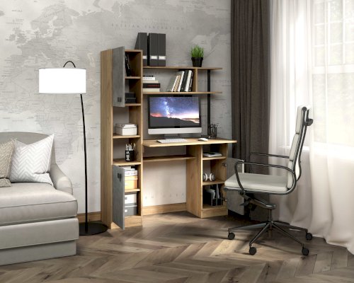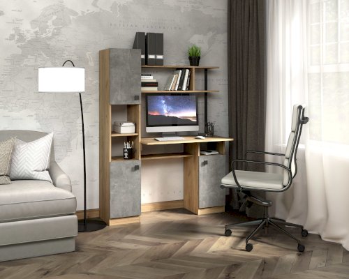 Пенал (дополнительная секция) превращает простой функциональный стол в полноценную рабочую зону, он вмещает закрытые полки для хранения документов и две ниши под дополнительную оргтехнику.