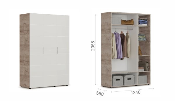 Современный распашной шкаф Джулия яркий представитель европейского минимализма. Это шкаф-конструктор, который позволяет выбрать подходящий вам размер, его наполнение и дизайн. На базе корпуса можно создать множество комбинаций: с зеркалами, с глухими глянцевыми фасадами, с порталом из ЛДСП 22мм или без него. Дополнительная опция – светодиодная подсветка монтируется в верхней части портала над каждой дверью. Шкаф выполнен из экологически безопасных надежных материалов. Декором белым глянцевым фасадам High Gloss служит фрезерованный рисунок «Волна» - делает интерьер спальни особенным и неповторимым. Торцевые ручки из хромированного металла - яркий акцент фасадов. Наполнение шкафа включает в себя вместительные полки и отделения со штангой, что позволяет создать систему для хранения вещей различного назначения. Идеально компонуются со всеми модулями системы Джулия.
