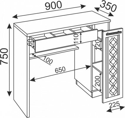 • Под столешницей располагается выкатной ящик, разделенный на 3 секции внутренними перегородками.