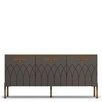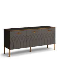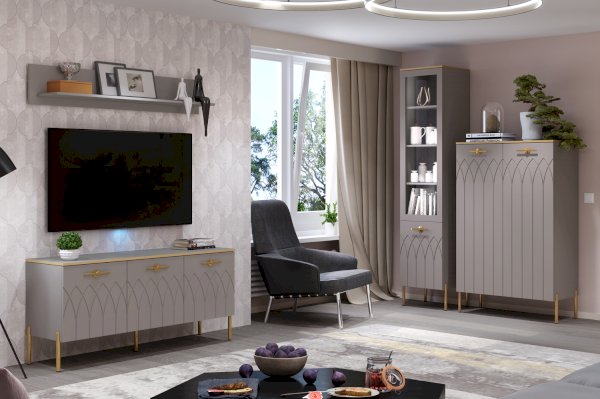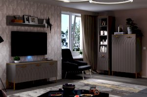 • Купить современную тумбу под ТВ - это отличное решение. Ведь ее эффектный внешний вид способен преобразить интерьер вашей гостиной. Фигурная фрезеровка фасадов, яркие металлические ручки, золотая кромка – все это создает яркий образ стильной тумбы для гостиной.