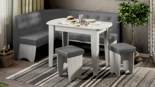 В любимом доме важно создать уют во всех помещениях, включая кухню. Для этой комнаты подойдет практичный дизайн, но желательно, чтобы он был стильным и оригинальным. Со всеми поставленными задачами успешно справится наш уголок «Барселона», в комплекте которого уже имеются стол и табуреты.