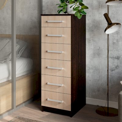 Невероятно практичная и функциональная модель комода Фиеста отлично впишется в любую комнату от коридора до спальни. Компактный размер изделия вместит в себя большое количество вещей за счет шести выдвижных ящиков. Верхнее отделение меньше остальных и прекрасно подходит для хранения мелочей. Комод Фиеста выполнен из ЛДСП высокого качества в контрастных цветах венеге и лоредо. Украшают модель удобные широкие ручки.