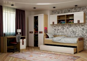 Мебель для детей «Стиль» в цвете «Кофе с молоком» отличается мягкостью, теплотой, особым уютом, что очень актуально для интерьера. Важное свойство глянцевой поверхности - оно визуально расширяет пространство. Модульный ряд состоит из шкафов, кроватей для одного или двух детей, письменного стола со встроенной тумбой, вместительных стеллажей и навесных полок для хранения книг, журналов, детских поделок, фотографий, сувениров. Яркая, стильная, но при этом удобная и вместительная, такая мебель будет радовать Ваших детей долгие годы.