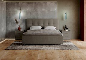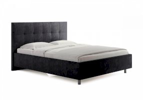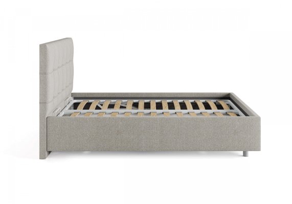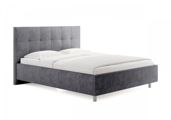 Лаконичная интерьерная кровать с изголовьем, украшенным декоративной строчкой. Модель изготовлена из ДСП. Обратная сторона изголовья обита темно-серым спандбондом, но, при желании, её можно выполнить из основного обивочного материала. В комплект кровати входит кроватное основание. Каркас основания выполнен из металла, ламели - из берёзы. При необходимости в комплект можно включить подъемный механизм с бельевым ящиком, который существенно увеличит объем хранения вещей,  а так же позволит легко производить уборку пыли под кроватью.