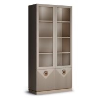 Шкаф-витрина выполнен в таких материалах как ЛДСП сатин и МДФ в матовой плёнке ПВХ с поверхностью soft touch. Лицевая фурнитура в цвете золото подчеркивает рисунок фрезеровки фасадов и делает мебель нарядной.