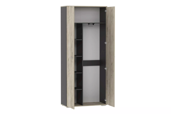 Двустворчатый шкаф оснащен двумя распашными дверьми, за которыми имеется несколько полок для хранения вещей, а также выдвижная штанга, на которой удобно разместить предметы гардероба, а лаконичные ручки серого цвета подчеркивают стиль коллекции. Дополните шкаф тумбой из одноименной коллекции, чтобы создать особо гармоничную атмосферу.