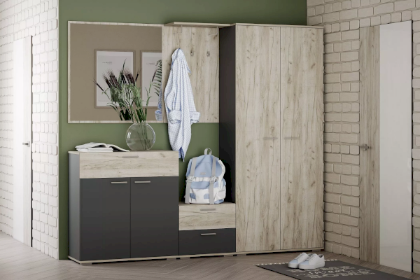 Шкаф представлен в двух цветах на выбор – Антрацит/Дуб Крафт Серый и Белый Фасадный/Дуб Крафт Золотой. Они отлично комбинируются между собой, дают отдых глазам. Подобное оформление поможет совместить функциональность и красоту помещения и сделать даже небольшую комнату уютным местом для приема гостей и хранения вещей.