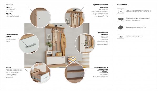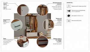 Белый Интер – современная прихожая в стиле минимализм - минимум декора, максимум функционала. Компактная и вместительная, с небольшой глубиной – она поможет правильно организовать пространство в небольшом помещении. Прихожая включает в себя необходимые модули: вешалка с крючками, вместительные обувницы, выдвижные ящики для мелочей, зеркало и двухстворчатый шкаф с выдвижной вешалкой и полками. Модное сочетание нейтральных цветов дуба сономы и белого наполнит комнату теплым и мягким светом, визуально увеличит пространство. Прихожая подойдет тем, кто любит практичность и разумность. Хорошо сочетается с модулями системы Стелс.