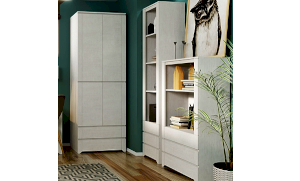 Двухдверный компактный шкаф Твист для одежды, оснащенный штангой и рядом полок. Нейтральный молочный цвет фасада оживляется геометричной фрезеровкой  на фасадах.