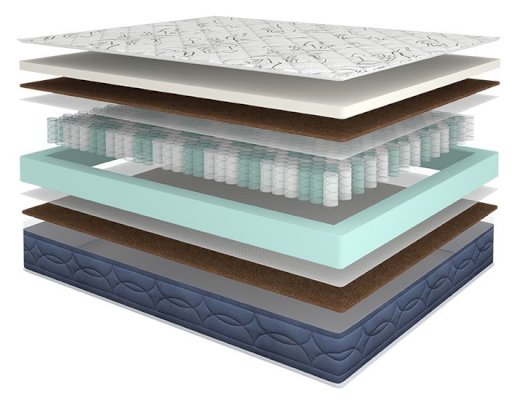 Наполнитель: Высокоэластичная пена ElasticFoam, кокосовая койра, НПБ “соты” 310 шт/кв.м., система усиления боковой поддержки, ППУ
