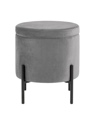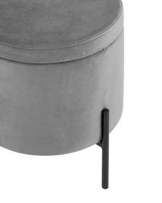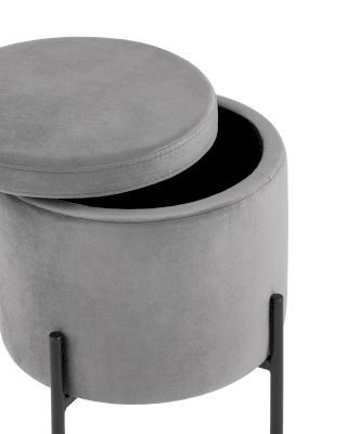 Лаконичный круглый пуф на металлических ножках. Мягкая обивка выполнена из износостойкого велюра, тактильно приятный и долговечный материал. Металлические ножки черного цвета высотой 13 см. выдерживают нагрузку до 80 кг. Подпятники в основании ножек делают пуф более устойчивым и предотвращают скольжение. Под сидением имеется ящик для хранения мелочей, крышка полностью съемная. Пуфик станет отличным дополнением для спальни, прихожей или зала.
