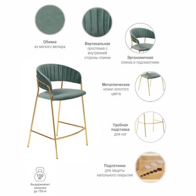 Полубарный стул Turin бирюзовый с золотыми ножками повторяет дизайн моделей стульев Turin и Avatar, что позволяет реализовать различные пространства помещения в едином стилевом решении.