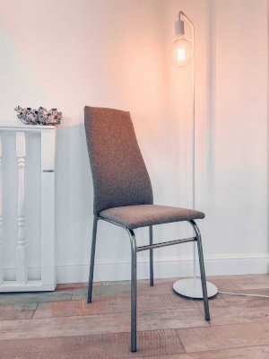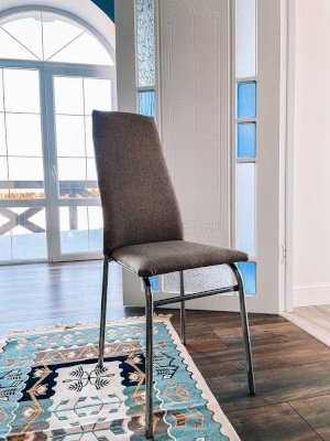 Сидение и спинка стула мягкие, обитые мебельной тканью. Универсален, удобен в использовании. Эргономичная спинка поддерживает не только поясницу, но и лопатки, тем самым сохраняет осанку. Изделие установлено на устойчивых металлических ножках с пластиковыми заглушками.