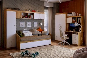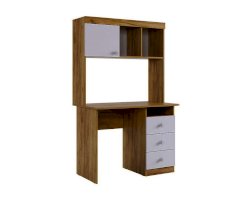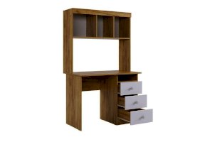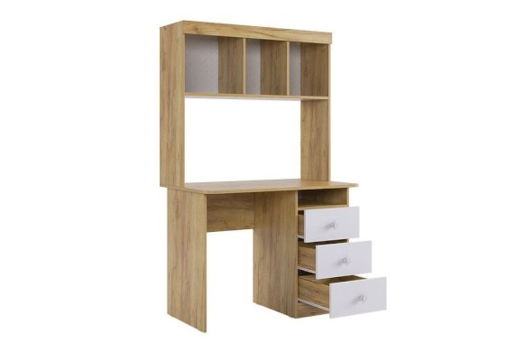 Компактный стол прекрасно впишется даже в маленькое пространство детской комнаты. Удобная столешница подойдет как для письма, так и для занятий на компьютере или ноутбуке. Открытые полки и закрытые ниши надстройки стола хорошо подходят для хранения учебников  и школьных принадлежностей. В 3-х выдвижных ящиков поместится все, что необходимо для учебы и творчества.