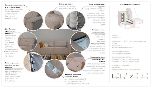 Брутальный диван с минималистическим дизайном и комфортной посадкой украсит современный интерьер, отлично подойдет для зонирования комнаты. Прямые линии силуэта подчеркиваются двойным декоративным кантом. Посадочное место образовано из двух частей, которые раскладываются независимо друг от друга и при необходимости прямую конфигурацию дивана можно менять на угловую. Инновационная система раскладки состоит из трех роликов на металлических направляющих, легко превращает диван в спальное место, исключает перекосы и деформацию короба. Металл в направляющих повышает их надежность и сопротивляемость нагрузкам. Независимый пружинный блок в основании дивана гарантирует комфортный отдых.