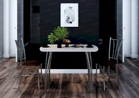Светлая отделка и простые формы стола обеденного №3 отлично сочетаются с современными интерьерами. Модель гармонично вписывается в обеденные зоны в стилях хайтек и минимализм. Столешница со слегка закругленными углами изготовлена из качественной МДФ. Материал устойчив к влаге и высоким температурам. Изогнутые металлические ножки придают изделию легкость и изящество.
