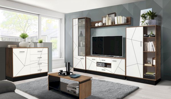 Журнальный стол, в отличие от других корпусных модулей, выполнен в одном цвете – таксония. Поэтому он выделяется на их фоне и привлекает к себе внимание. Такой столик нужен обязательно! На боковых стенках-опорах сделаны накладки, которые придают внешнему дизайну эффект 3-Д, поскольку панели находятся на разных уровнях.
