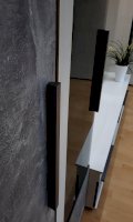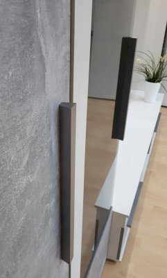 Дизайнерские штрихи. Удачно подобранные ручки оттеняют красоту бетона. Они изготовлены из массива дерева и окрашены в серебристый цвет.