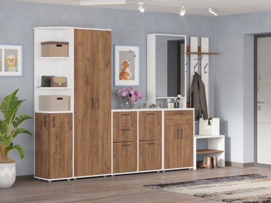 Тумба с зеркалом в прихожую. Снизу находиться вместительная тумба под обувь, сверху трельяж за закрытым зеркалом. Также имеется выдвижной ящик для различных мелких предметов. Может быть использована как дополнительный модуль ПР-7 или как самостоятельно изделие.