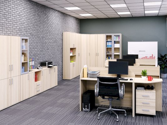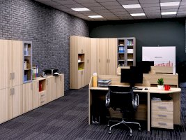 Закрытый шкаф для документов. За дверцами расположены вместительные полки. Стеклянные дверцы, придают конструкции визуальную легкость.