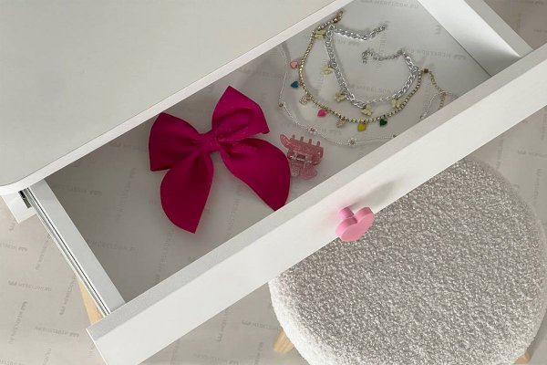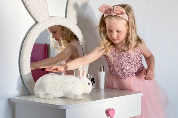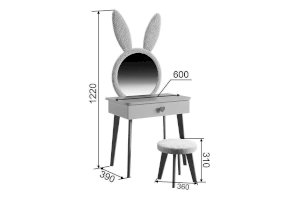 Комплект многофункционален: девочка может наводить красоту, смотрясь в круглое зеркало, мягкие уши из плюша можно использовать как крючки для украшений, на столешнице разложить все нужные и важные вещи для марафета или лепить из пластилина и рисовать. В выдвижной ящик на шариковых направляющих складывать необходимые вещи. Тактильно приятная на ощупь ручка в форме сердечка, ни кого не оставит равнодушным, к ней захочется прикасаться все снова и снова.