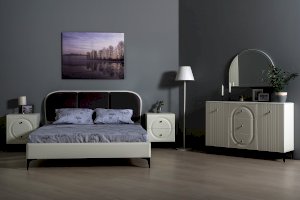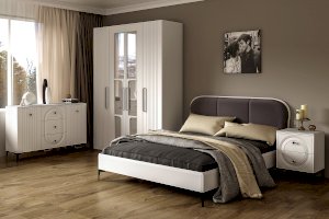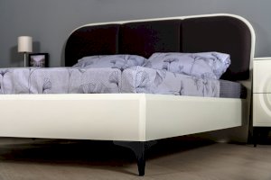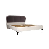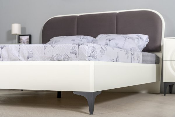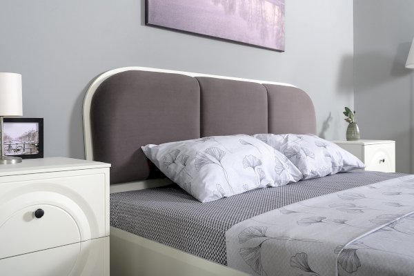 Кровать установлена на высокие ножки, что делает конструкцию лёгкой и воздушной, изголовье кровати декорировано пышным мягким элементом. Матрас укладывается на ортопедическое основание с гнутоклееными ламелями.