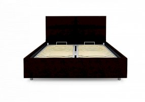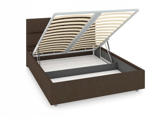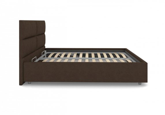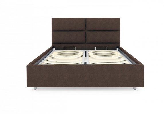 Лаконичная модель с изголовьем из объемных прямоугольников, сшитых между собой. Царги кровати выполняются по технологии съемного чехла. Модель изготовлена из ДСП. Обратная сторона изголовья обита спандбондом, но, при желании, её можно выполнить из основного обивочного материала. В комплект кровати входит кроватное основание. Каркас основания выполнен из металла, ламели - из берёзы. При необходимости в комплект кровати можно включить подъемный механизм с бельевым ящиком, который существенно увеличит объем хранения вещей, а так же позволит легко производить уборку пыли под кроватью.