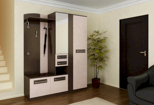 Венге/ Липа Светлана Отличительные особенности прихожей — функциональный дизайн и современные оттенки текстур. Конструкция данной модели включает в себя все необходимое: зеркало, шкаф, пенал, вешалки, ящики и множество полок для различных мелочей.