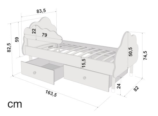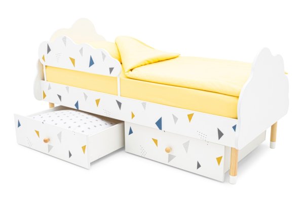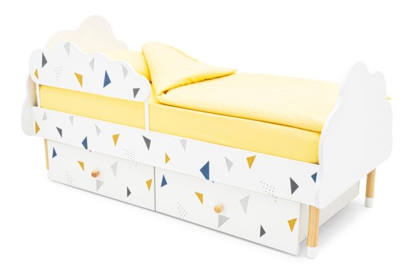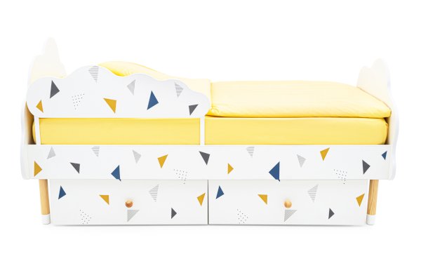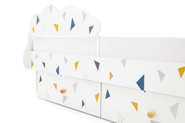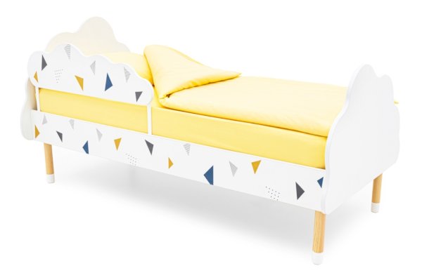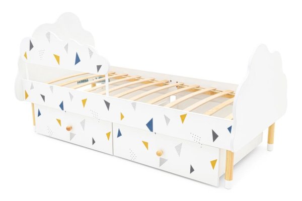 Изголовье и изножье кроватки сделаны в виде облака. Высота от пола до самого высокого места составляет 66 см. Это позволяет даже маленькому ребенку комфортно забираться и спускаться с нее, не рискуя упасть. Специальная конструкция кровати позволяет с лёгкостью присесть или прилечь рядом взрослому, если ребенок не может заснуть.