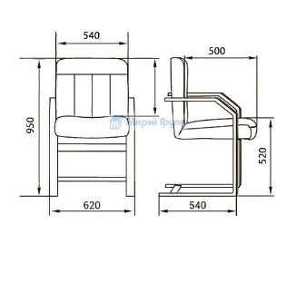 Кресло с низкой спинкой на деревянных полозьях, с подлокотниками прямоугольной замкнутой формы с мягкими накладками обитыми в цвет кресла.