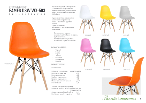 Дизайнерский стул EAMES DSW WX-503 - простая, но тщательно продуманная модель, идеально подходит к интерьерам в стиле модерн, лофт, хай-тек. Стул EAMES DSW выполнен из высокопрочного литого полипропилена с ножками из сочетания дерева и металла. Модель EAMES DSW органично впишется практически в любую среду дома и офиса, универсальный для использования в кафе и ресторанах (направление «Hpreca»).