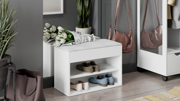 Тумба для обуви имеет открытую нишу для бережного хранения обуви и место под откидной крышкой. Данное пространство можно использовать для хранения обувных аксессуаров и различных мелочей, что без сомнений является преимуществом новинки.