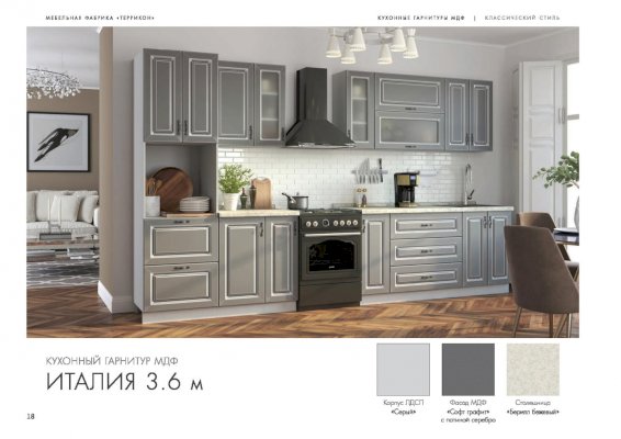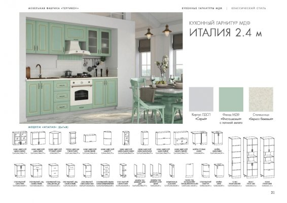 Кухонный гарнитур «Италия» воплотил в себе роскошь и эстетизм этой прекрасной средиземноморской страны. На суд покупателей представлены комплекты с отделкой под графит, платину, беленый дуб, а также великолепные модели фисташкового цвета. Шикарный вид придают дизайнерская фурнитура, дверцы шкафчиков из рифленого стекла, золоченные прямоугольники на фасадах.