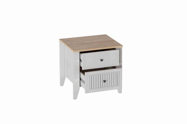 Тумба прикроватная Валенсия выполнена из ЛДСП в комбинации Дуб натуральный светлый / Персидский жемчуг.
