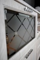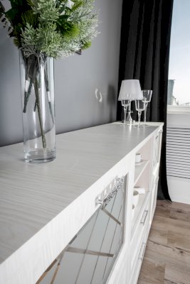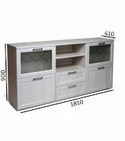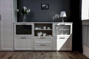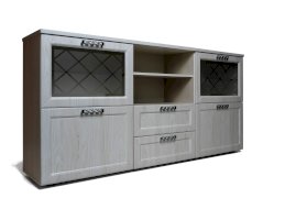 Дизайн комода функциональный и эстетичный. В конструкции все продумано до мелочей: есть два выдвижных ящика для небольших предметов, две открытые полки предназначены для предметов, которые хочется оставить на виду. Дверки со стеклом придают легкость. просторная столешница может послужить как для размещения телевизора, так и для любимых книг, статуэток и других аксессуаров.