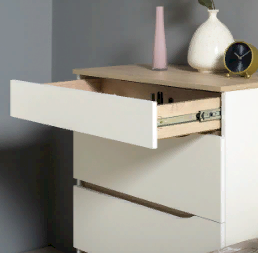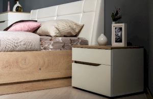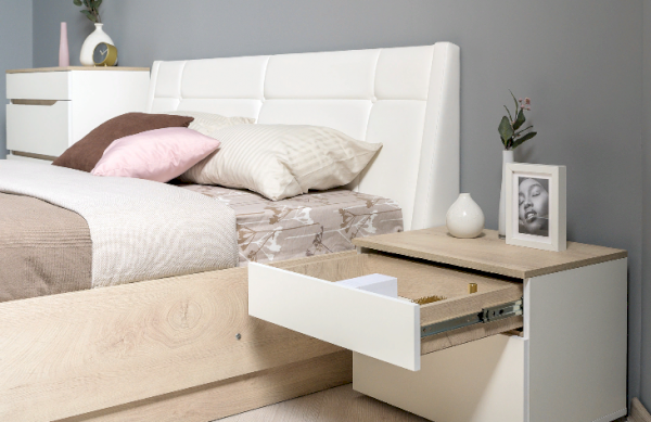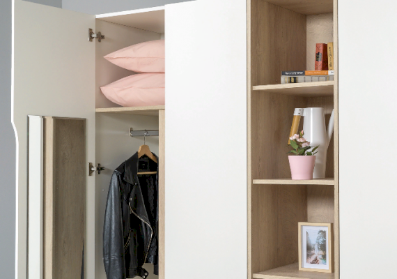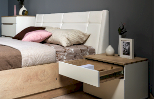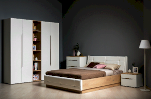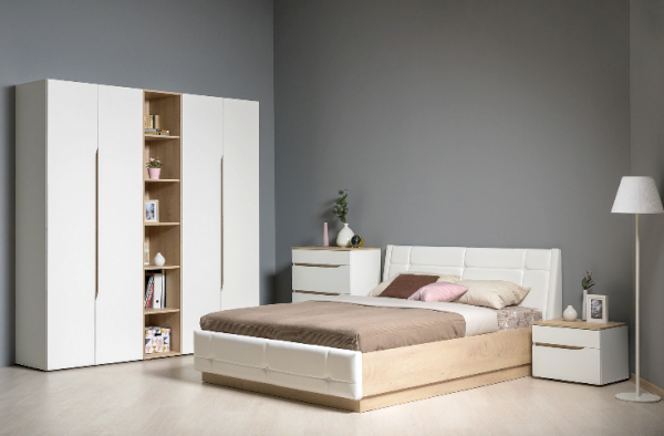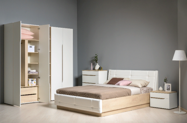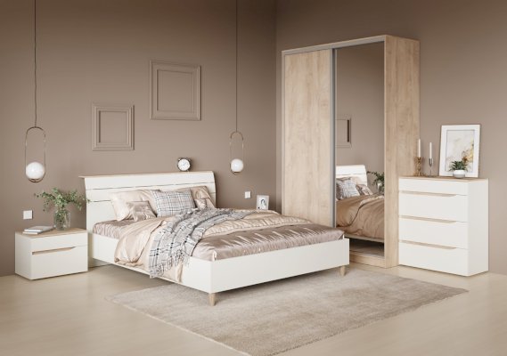 Это современное, практичное и уютное решение для спальни. Мягкое изголовье кровати установлено с небольшим наклоном, что даёт возможность не только лежать, но и комфортно сидеть, как на диване. Подъёмный механизм обеспечивает удобный доступ к вместительной системе хранения. Все изделия установлены на регулируемые опоры, что значительно упрощает установку и позволяет компенсировать неровности пола. Лицевую фурнитуру заменяет стильный вырез, за которым видно древесный декор корпуса. Вырезы делают внешний вид изделий асимметричным, что делает композицию современной и динамичной. Стеллаж и шкафы могут быть собраны в единую компоновку, давая возможность собрать в интерьере стильную шкафную группу. Наполнение шкафа может собрано на любую сторону, два выдвижных ящика скрыты за распашными фасадами, на обратной стороне которых размещается зеркало.