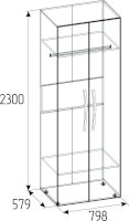 Распашной шкаф для одежды - классический шкаф для спальни. Фасады с ручками, укутанными в экокожу. Шкаф комплектуется стационарной штангой длиной 757 мм, на которой можно разместить до 10 плечиков с верхней одеждой, а также двумя полками. Регулируемые опоры компенсируют незначительные неровности пола.