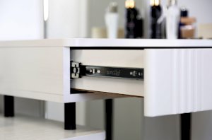 Туалетный столик  "Ева" прекрасно впишется в интерьер спальни или ванной комнаты благодаря своему стильному дизайну и функциональности. Вместительные выкатные ящики обеспечат удобное хранение косметики, украшений и других мелочей. Шариковые направляющие гарантируют легкость открывания и закрывания ящиков, а металлические ручки добавляют стильный акцент. Высокие черные опоры придают столику устойчивость и элегантность. Цветовое сочетание белого корпуса из ЛДСП и фасада из МДФ облицованного пленкой ПВХ создает свежий и модный образ мебели. Необычная фрезеровка фасада добавляет изысканности и утонченности этому туалетному столику.
