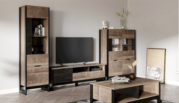 Шкаф-витрина со стеклянным фасадом – современное решение для гостиной или прихожей в стилях лофт, сканди, эко-минимализм. За стеклом размещены полки для предметов интерьера или красивой посуды. Нижние отделения с глухими фасадами служат для хранения личных вещей. Отсутствие лицевой фурнитуры подчеркивает минимализм и геометрию модуля. Особенность дизайна – это сочетание реалистичных по цвету и тактильности трендовых декоров, которые соответствуют последним городским тенденциям. «Дуб Гранж» привлекает имитацией вручную обработанного дерева и выразительной зернистой текстурой, характерной формой досок. Стильный серый цвет «Железного камня» с металлическими разводами и новая текстура состаренной штукатурки в сочетании с гладкостью металла вносят индустриальный колорит. Оригинальные ножки-опоры из МДФ контрастного цвета придают изюминку, а светодиодная подсветка усилит впечатление от созданного интерьера.