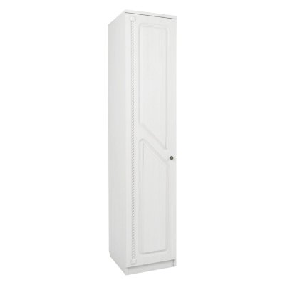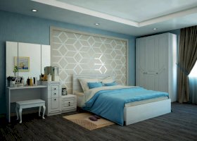 Спальня, выполненная в новом декоре ЛДСП и МДФ - Бодега белый, с использованием мягкого элемента «Белый Пунто», являет собой удивительное сочетание шикарного белого цвета и приятного тактильного ощущения. Высокие шкафы придают спальне несомненную практичность и функциональность, а интересная фрезеровка на фасадах - особый шарм классическому стилю.