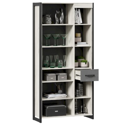 • Слева отделение шириной 540 мм. Вверху за распашной рамочной дверью со стеклом ниша с 2-мя полками из ЛДСП. Размер каждого отделения 540х334 мм.