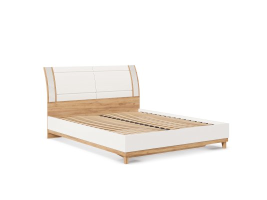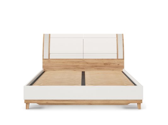 • Кровать с жестким изножьем и изголовьем, выполненных из гнуто-клеенных панелей, покрытых пленкой ПВХ, выполняющих роль дверей, закрывающих 2 ниши для хранения