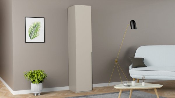 Распашной шкаф пенал имеет 1 дверцу с длинной профильной ручкой черного цвета. В комплекте идут полки (5 штук) и горизонтальная штанга. Это позволяет создать нужное наполнение напольному пеналу: он может выполнять функции бельевого, плательного или быть комбинированным (особенно актуально для детской комнаты, ведь одежда на плечиках не занимает много места и на оставшемся пространстве можно установить полки и положить туда другие вещи).