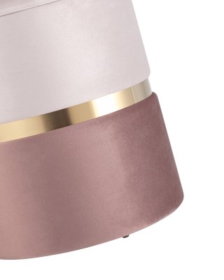 Лаконичная модель пуфа в мягкой обивке прекрасно впишется в современные интерьеры. Обивка выполнена из велюра в светлом и темном оттенках и украшена металлическим ободком в золотом цвете. Под сиденьем имеется ящик для хранения различных мелочей. В основании предусмотрены специальные подпятники, которые делают пуф более устойчивым и предотвращают скольжение.