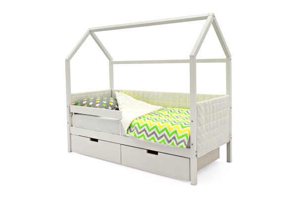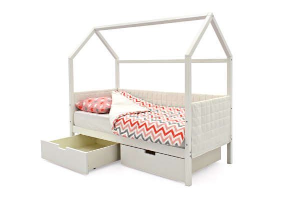 Комплект кровати состоит из каркаса кровати, мягких чехлов на бортики и ортопедического основания. Дополнительный бортик, ящики, матрас и постельные принадлежности приобретаются отдельно.