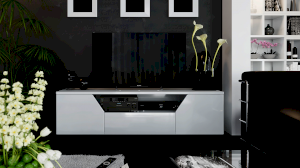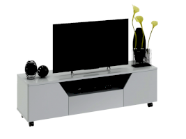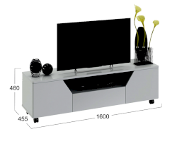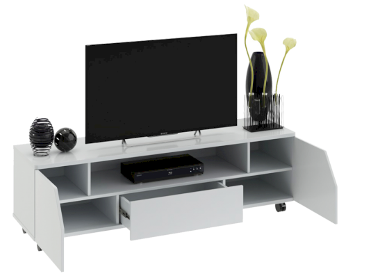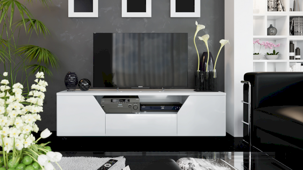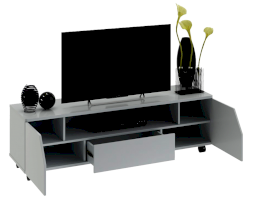 Тумба ТВ оснащена открытой нишей для техники, выдвижным ящиком, закрытыми секциями и широкой поверхностью подставки под телевизор. Отличительной чертой тумбы является отсутствие лицевой фурнитуры, что позволяет открывать ее с помощью захвата фасада рукой.