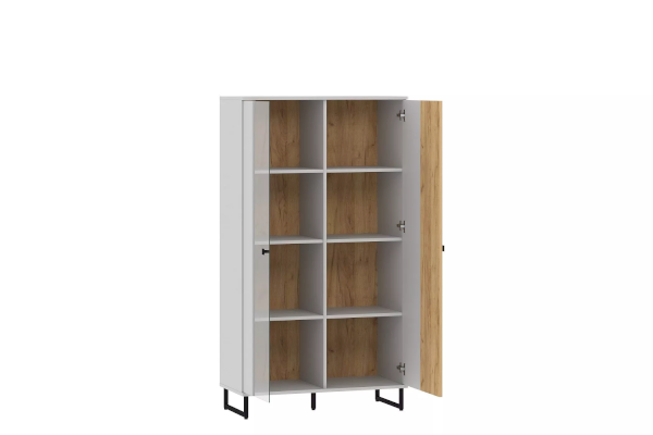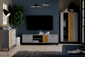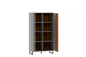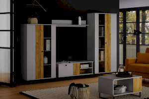 Коллекция БРУНО – это современный дизайн с характером, который отлично впишется в стиль лофт. Цвет платиново-серого и золотого дуба гармонично подчеркнут контрастными элементами – стеклом в витринах, черными ручками и черными металлическими опорами.