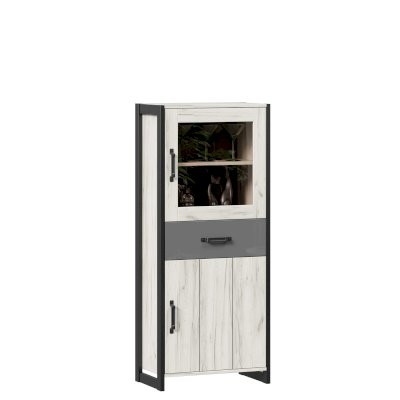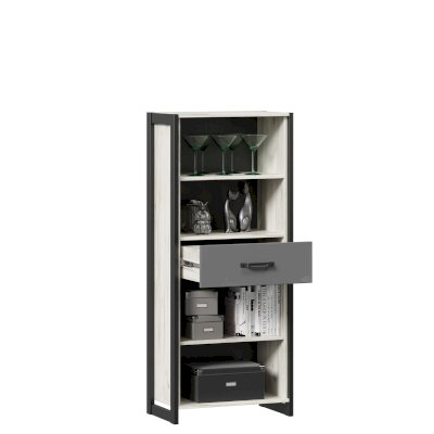 - Сверху за распашной рамочной дверью со стеклом ниша с 1 полкой из ЛДСП. Размер каждого отделения 524х265 мм. Размер двери 552х560 мм.