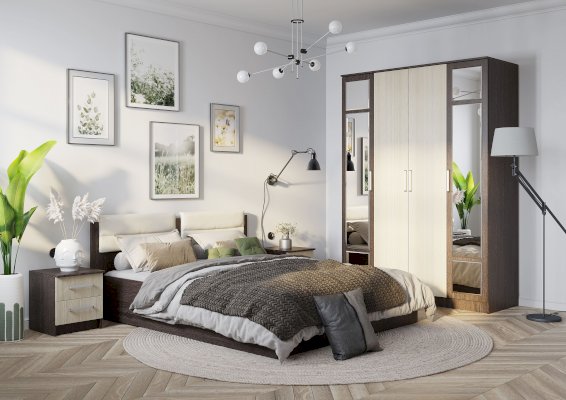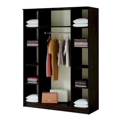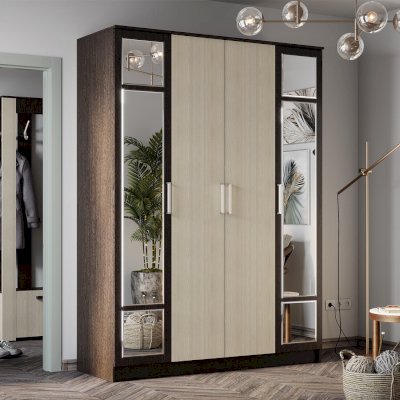 Разместить большой гардероб вы сможете благодаря четырёхстворчетому шкафу Фиеста. Модель выполнена из ЛДСП в комбинации цветов венге и лоредо, две створки являются зеркальными. Внутреннее наполнение состоит из большого центрального отделения со штангой для верхней одежды и вещей на вешалках. Справа и слева от платяной зоны находятся полки. Фасады оснащены эргономичными ручками. Шкаф всегда можно добавить другими модулями из одноименной мебельной серии.
