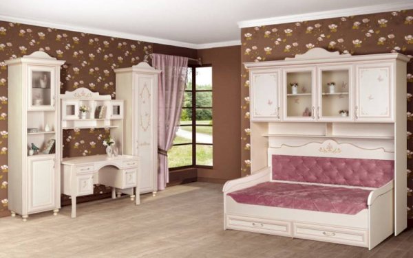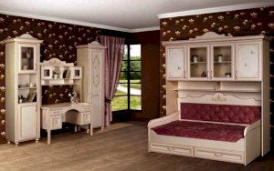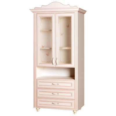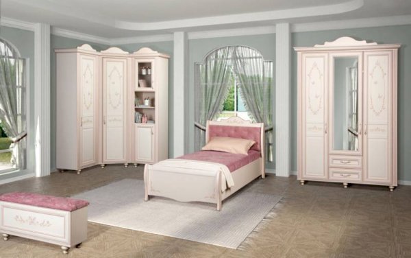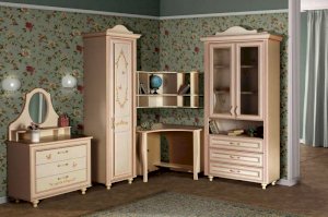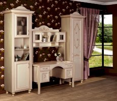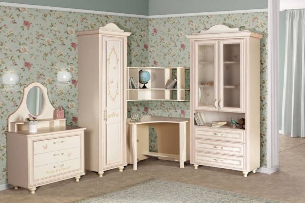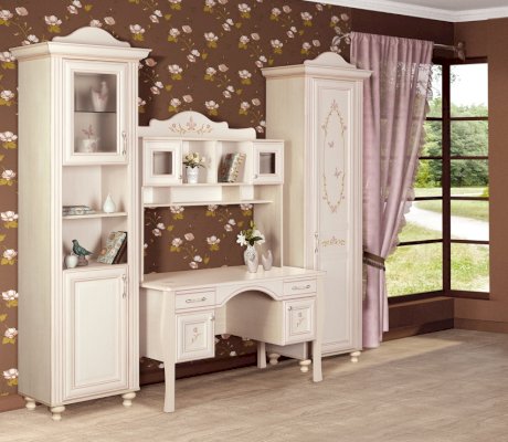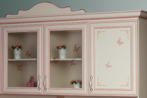 Мебель для детской комнаты «Алиса» – мебель для девочек и девушек, стилизована под Прованс, который поддержан светлым декором, цветочными рисунками и патиной на фасадах. При создании детской использовались приемы итальянского декорирования мебели. Мотивы классической росписи в сочетании с любимым мотивом детского рисунка – бабочки и цветы – создают ощущение юности и нежности. Использование декоративных элементов – корон и карнизов в наборе мебели не перегружают интерьер детской комнаты и при этом создают ощущение интерьера маленькой принцессы. Изящные ручки под золото со вставками молочно-белого цвета идеально сочетаются с кремово-белым декором и золотистой палитрой рисунков вензелей. При всей внешней легкости и утонченности мебель весьма практична в использовании, благодаря надежной фурнитуре «Hettich». Еще одним плюсом детской «Алиса» является большое количество различных модулей, позволяющих собрать комплект для любой комнаты.